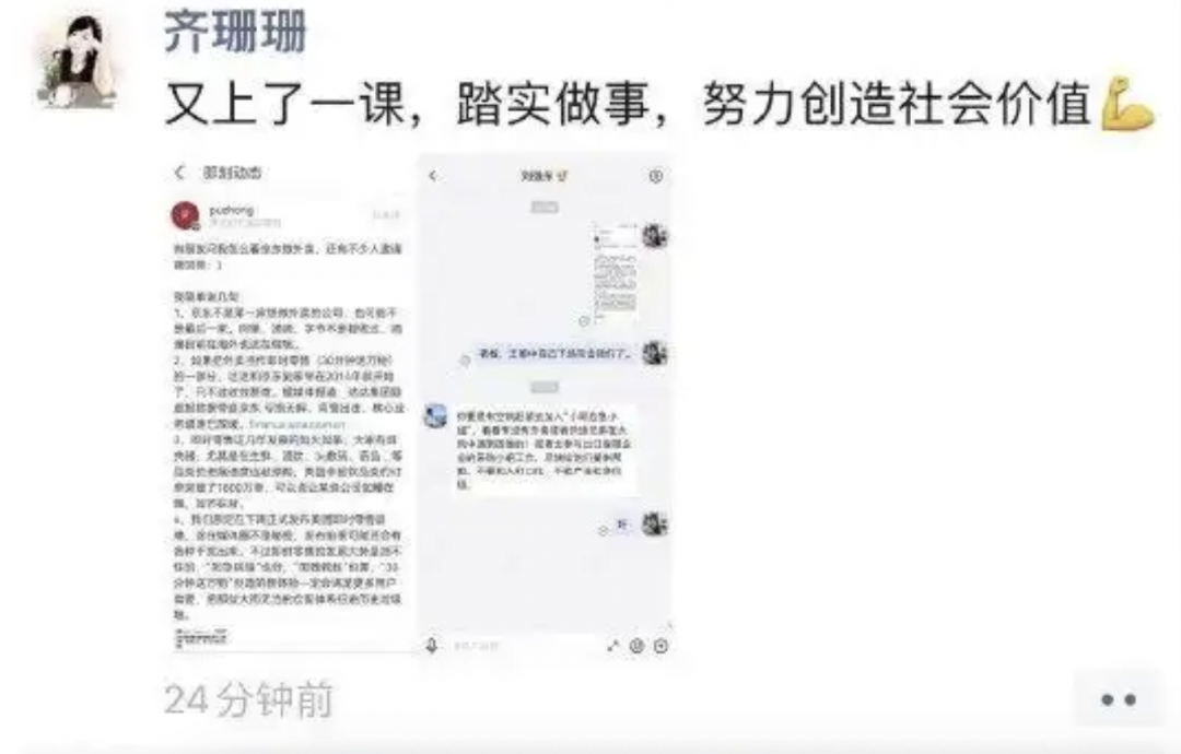 【TechWeb】4月12日消息,今日,京东集团新闻发言人齐珊珊在朋友圈发布了与京东集团创始人刘强东的内网对话,并表示:“又上了一课,踏实做事,努力创造社会价值。”