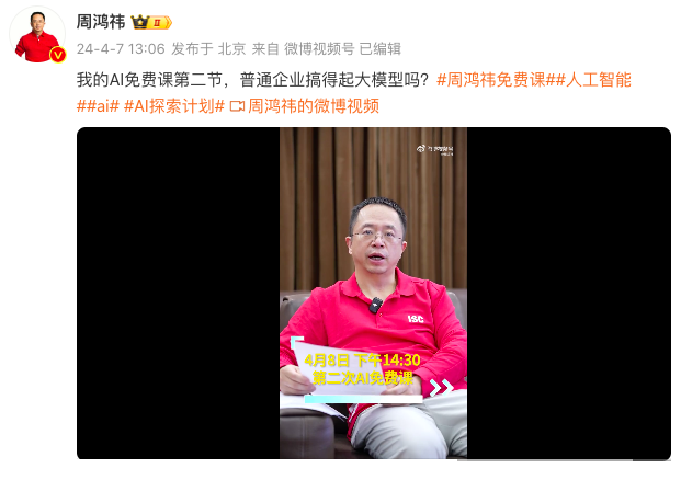 【TechWeb】4月8日消息,360创始人周鸿祎在微博发布视频,预告将于今天下午2点半开始第二次AI免费课,这次主题是“企业如何拥抱AI”。