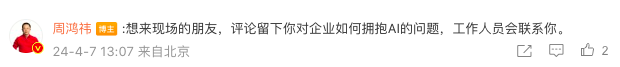 周鸿祎透露,这次免费课邀请几十位企业家现场交流,分享传统企业如何拥抱AI,实现数字化转型和智能化升级。