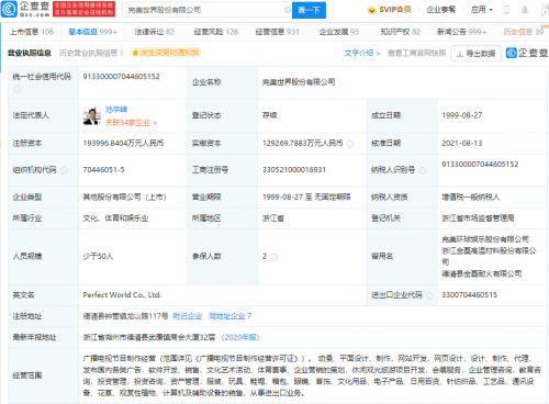 企查查信息显示,完美世界成立于1999年,法定代表人为池宇峰,经营范围包含: 动漫、平面设计、制作,网站开发,网页设计,设计、制作、代理、发布国内各类广告等,其大股东为完美世界控股集团有限公司,持股25.33%。