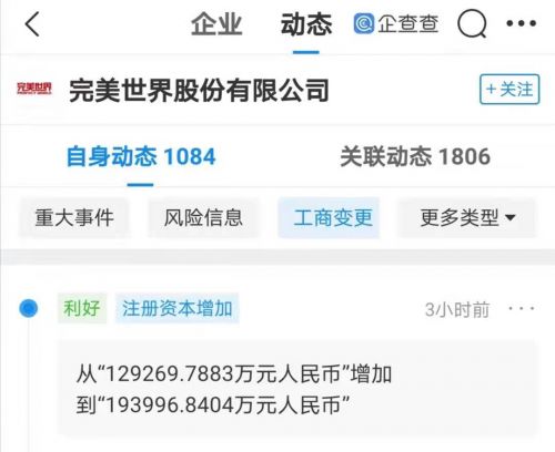 【TechWeb】企查查APP显示,近日,完美世界(002624)发生工商变更,公司注册资本由12.93亿元人民币增加至19.4亿元人民币。