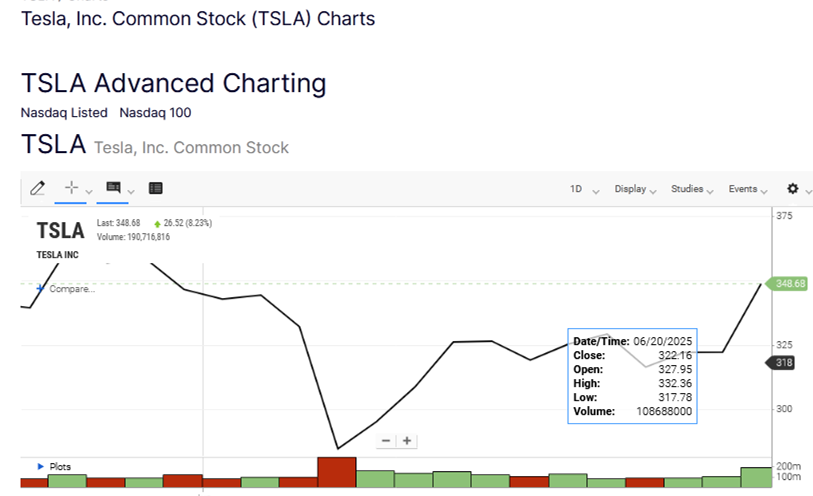 周一美国股市收盘时,特斯拉报348.68美元,较上周五收盘时的322.16美元上涨26.52美元,涨幅为8.23%。