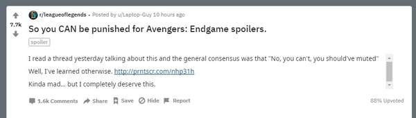 尽管《复仇者联盟4》在本周三(4月24日)就上映了,除了部分观众选择第一时间观看外,也有不少人都希望利用五一长假陪亲朋一起去看,这时“剧透”风潮慢慢散发开来。Reddit上一位玩家Laptop-Guy近日在《英雄联盟》板块发帖称,在游戏中剧透《复仇者联盟4》剧情会被拳头封号了三天。
