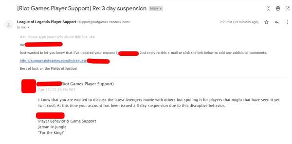 拳头官方发给玩家的邮件中写到:“我知道你很兴奋想要和其他人讨论最新的《复仇者联盟》电影,但向那些还没看过这部电影的玩家剧透,这样做并不好,对此您的账号由于这一破坏行为被封禁三天。”