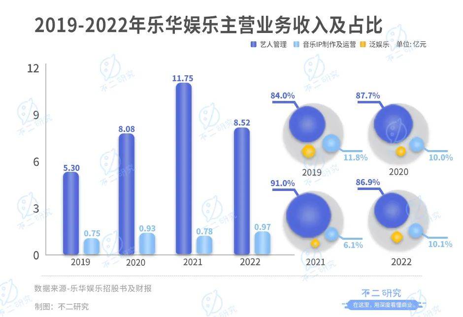 据招股书及财报显示,2019-2022年,来自艺人管理的收入分别为5.30亿元、8.08亿元、11.75亿元和8.52亿元,占收入总额百分比为84.0%、87.7%、91.0%和86.9%;来自音乐IP制作及运营的收入分别为0.75亿元、0.93亿元、0.78亿元和0.97亿元,占收入总额百分比为11.8%、10.0%、6.1%和10.1%;来自泛娱乐业务的收入分别为0.26亿元、0.21亿元、0.38亿元和0.30亿元,占收入总额百分比为4.2%、2.3%、2.9%和3.0%。