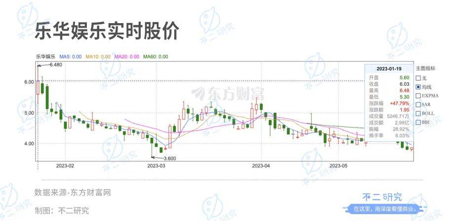 4月25日,财报公布的首个交易日,其股价下跌2.06%,截至2023年5月23日港股收盘,乐华娱乐报收3.81港元/股(折合人民币3.43元),对应市值33.22亿港元(折合人民币29.90亿元)。对比上市首日市值,已蒸发近20亿港元。