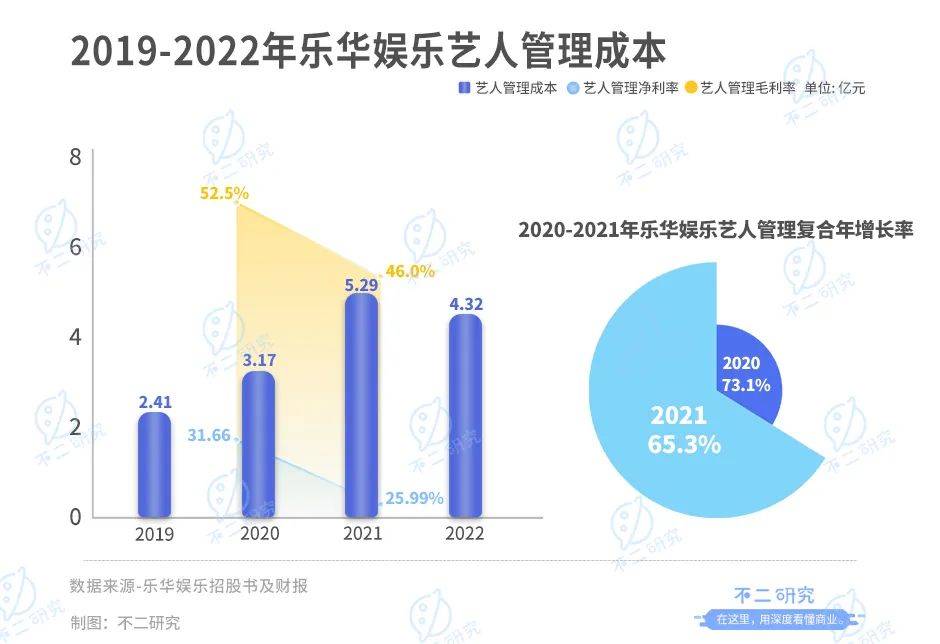 此外,据招股书及财报显示,2019-2022年,艺人管理的成本分别为2.41亿元、3.17亿元、5.29亿元和4.32亿元,2020-2021年复合年增长率为33.43%和65.27%,2021年较2020年有所提高。