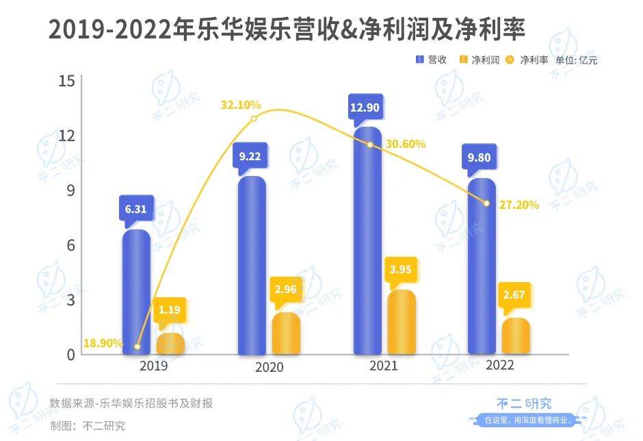 据招股书及财报显示,2019-2022年,乐华娱乐的收入分别为6.31亿元、9.22亿元、12.90亿元和9.80亿元。同期,经调整后年内净利分别约为1.19亿元、2.96亿元、3.95亿元和2.67亿元,净利率18.90%、32.10%、30.60%和27.20%。