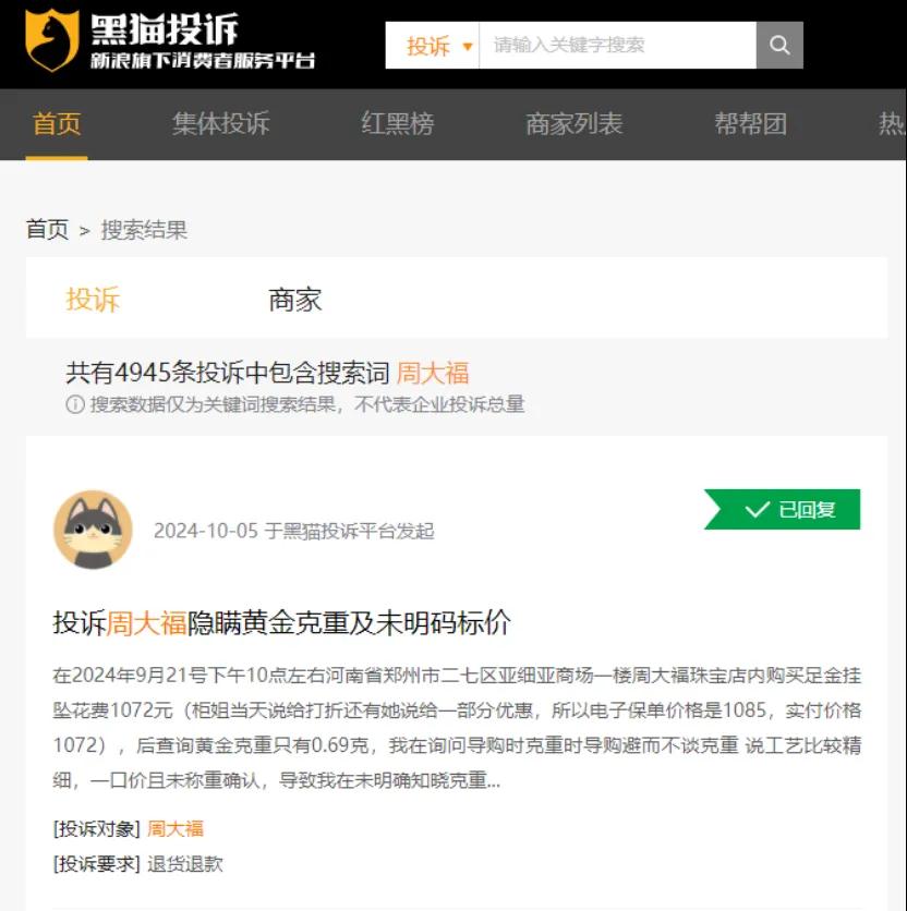 另外,周大福除了“贵”,在社交平台被大众广为吐槽的点居然是“服务态度差”。在小红书搜索#周大福服务#有3w+帖子,其中大部分都是吐槽贴。在黑猫投诉上,周大福的投诉已经将近5000条,在去年9月是超3300条,一年时间增加了近1700条。