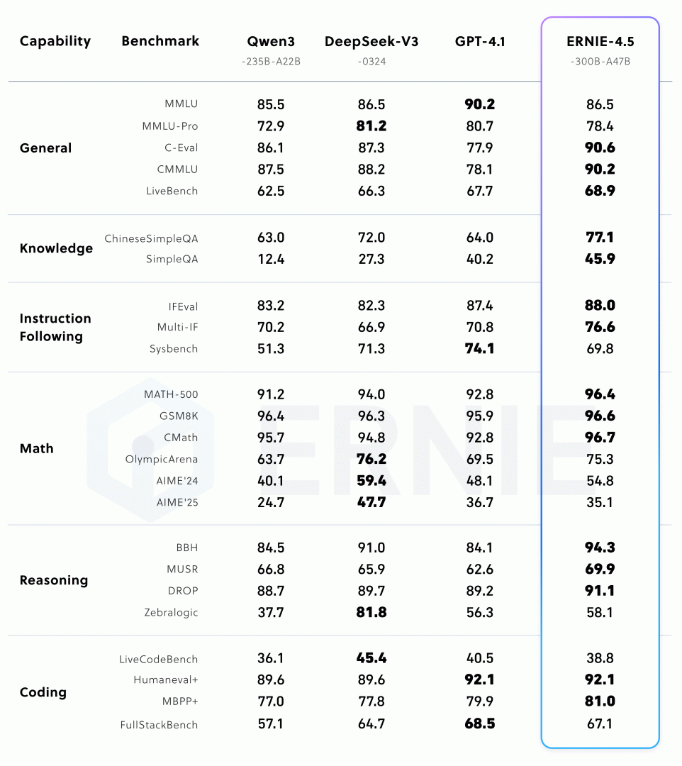 图注:ERNIE-4.5-300B-A47B后训练模型的性能