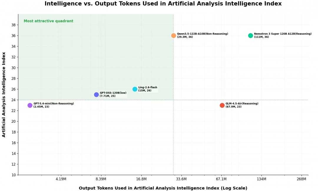 据权威三方评测Artificial Analysis 数据,Ling-2.6-flash 展现了突出的 Token Efficiency 优势,以 15M output tokens 实现了 26 分 的 Intelligence Index,在保持较强智能水平的同时,将输出消耗控制在相对更低的位置。相比部分依赖更长输出换取更高分数的模型,Ling-2.6-flash 在“智能表现”与“输出成本”之间取得了更优平衡。