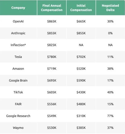 薪酬谈判公司Rora Research曝光的信息显示,创业公司砸重金求才,OpenAI提供的年薪高达86.5万美元(约625万元人民币),底薪为66.5万美元,薪资增幅可达30%。大厂方面也不遑多让,亚马逊提供71.9万美元的年薪,薪酬谈判增幅高达38%。