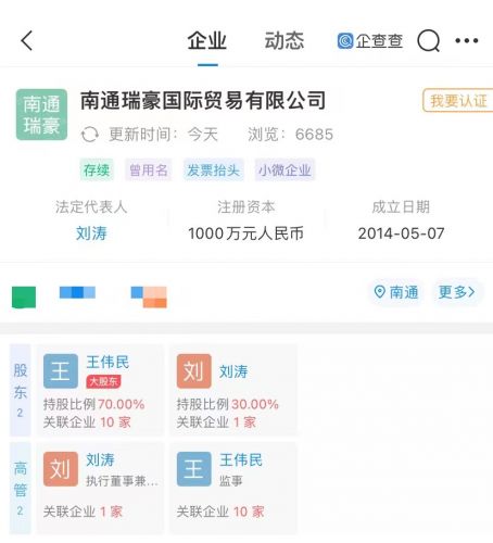 企查查APP显示, 南通瑞豪成立于2014年5月,法定代表人为刘涛,注册资本为1000万元人民币,经营范围包含:有色金属、电动工具、五金、百货、针纺织品、建筑材料、劳保用品销售;房产经纪等,大股东及实际控制人为王伟民,持股70%。