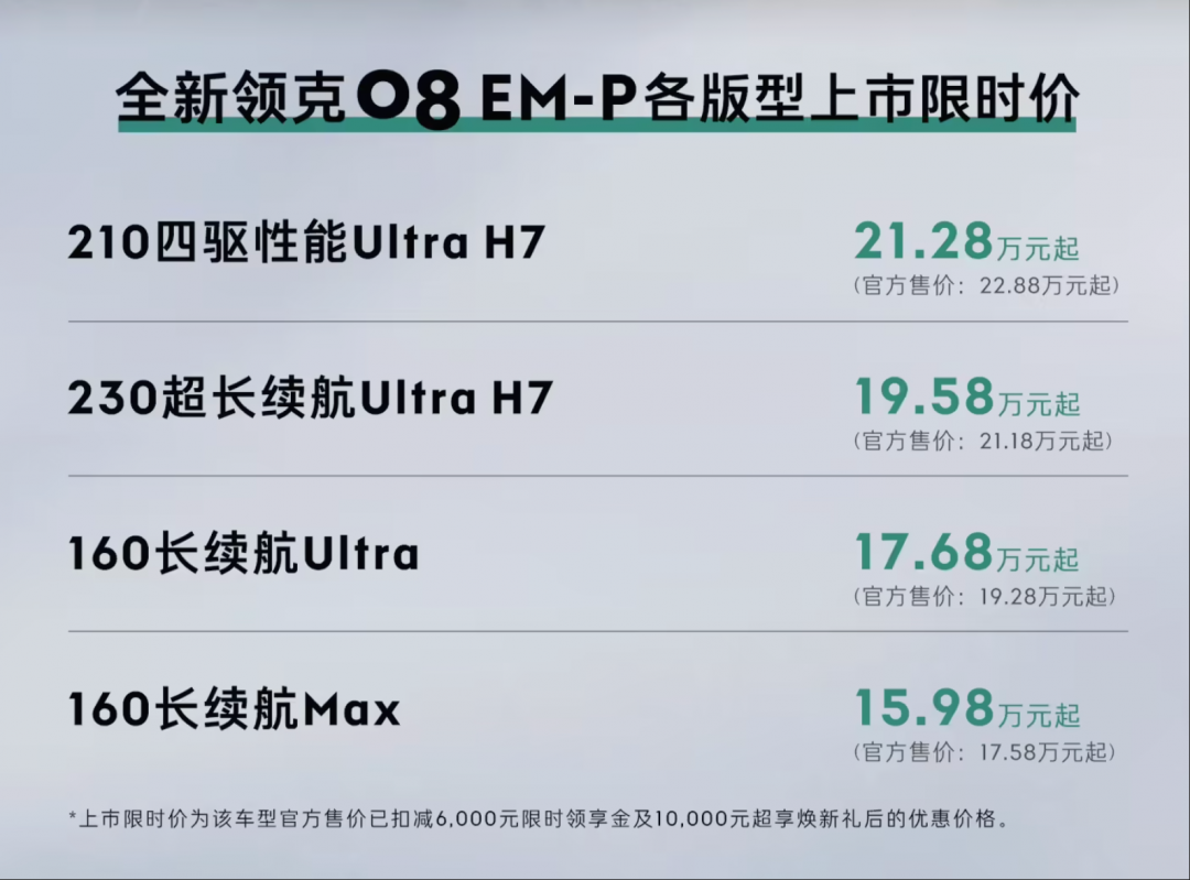 【TechWeb】9月24日,全新领克08 EM-P正式登陆市场,推出4款配置车型,官方指导价17.58-22.88万元,上市限时优惠价低至15.98-21.28万元。