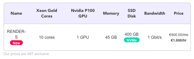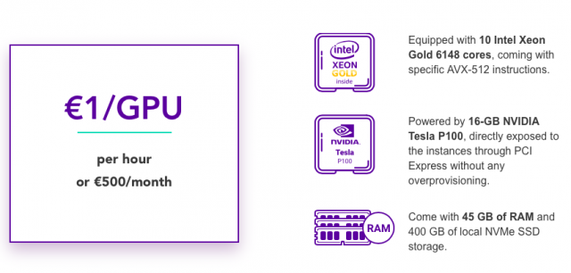 法国这家名为Scaleway提供的GPU云服务搭载Nvidia Tesla P100,配备16GB内存,400 GB的SSD存储,并具备10核Intel Xeon 的CPU。同样的配置,在谷歌云上,标价为每小时1.6美元(10.7元),微软云标价每小时2.07美元(13.9云)元法国Scaleway似乎在与这云服务商进行着价格竞争。