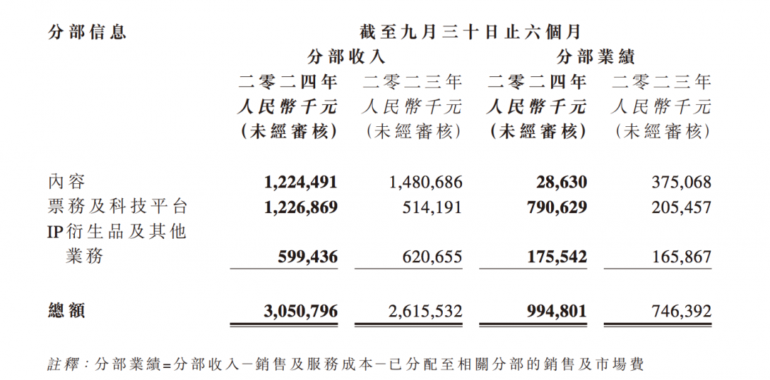 业绩公告显示,2025上半财年,阿里影业内容收入人民币12.2亿元,同比下降2.6亿元;票务及科技平台收入人民币12.3亿元,同比增长7.1亿元;IP衍生品及其他业务收入约人民币6亿元,同比下降0.2亿元。