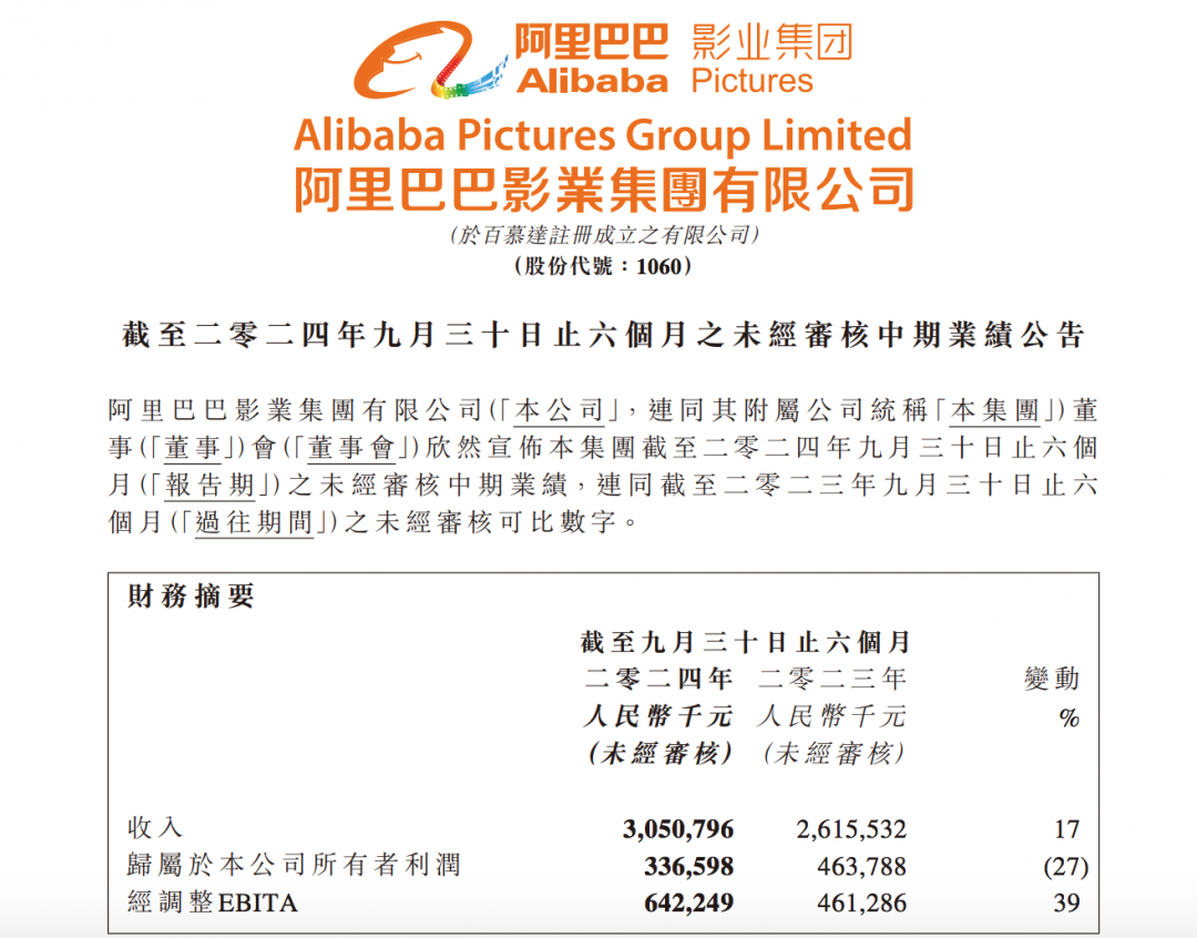 阿里影业发布S1财报:经调整EBITA盈利人民币6.42亿元 同比增长39%快讯