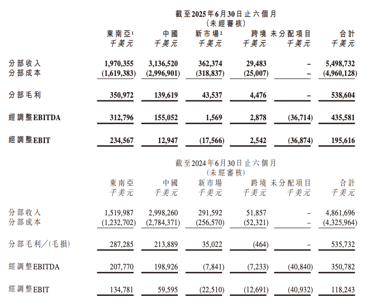 极兔速递2025年上半年、2024年上半年全球分部收入
