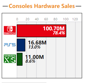 今日,据VGChartz数据显示,目前任天堂Switch全球销量已突破1亿台,成为史上第七款销量过亿的游戏主机。