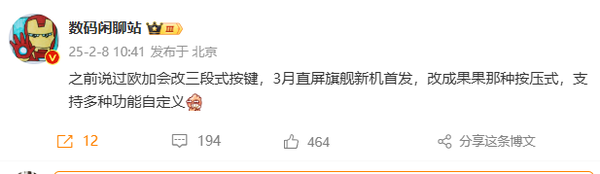 而OPPO Find X8 Ultra预计也将支持类似的多样化功能,【TechWeb】在此前推出的OPPO Find X8系列上,全新的OPPO Find X8 Ultra将取消传统的三段式按键设计。