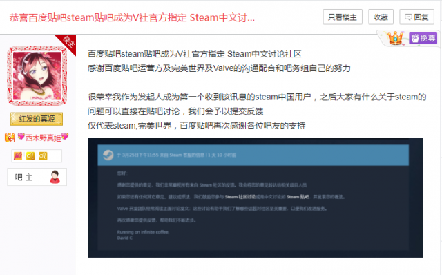 3月27日昨天一则消息振奋了所有百度贴吧的吧友们,根据百度贴吧“Steam吧”吧主“西木野真姬”的最新帖子,steam贴吧成为V社官方指定的Steam中文讨论社区,然而今天Steam官方声称未与国内任何社交平台合作包括百度贴吧,尴尬症直接犯了。