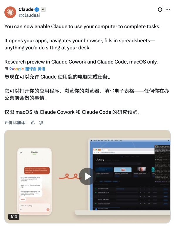 Anthropic旗下AI模型Claude近期向Claude Pro和Claude Max付费订阅用户开放测试电脑操作接管功能,用户可通过手机向电脑端Claude发送语音或文本指令,功能通过Claude Cowork和Claude Code两款应用。