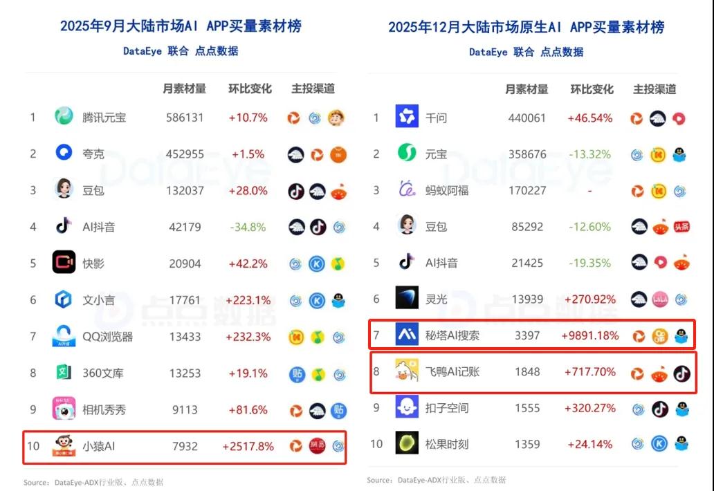 数据显示,瞄准二次元领域的狸谱2025年1-3月投放量均位居前十;猿辅导的小猿AI则在9月开学季投放素材量暴涨2517.8%;此外,记账类应用飞鸭AI记账在年底突然冒出,12月投放素材量同比大涨717.7%;专注AI搜索领域的秘塔AI搜索也在12月突然发力,投放素材量环比大涨9891.18%,跻身月度买量榜第七。