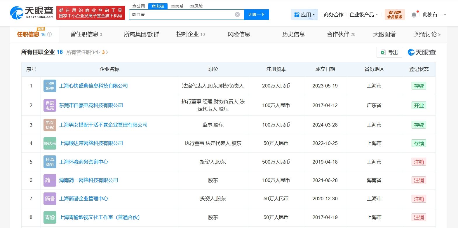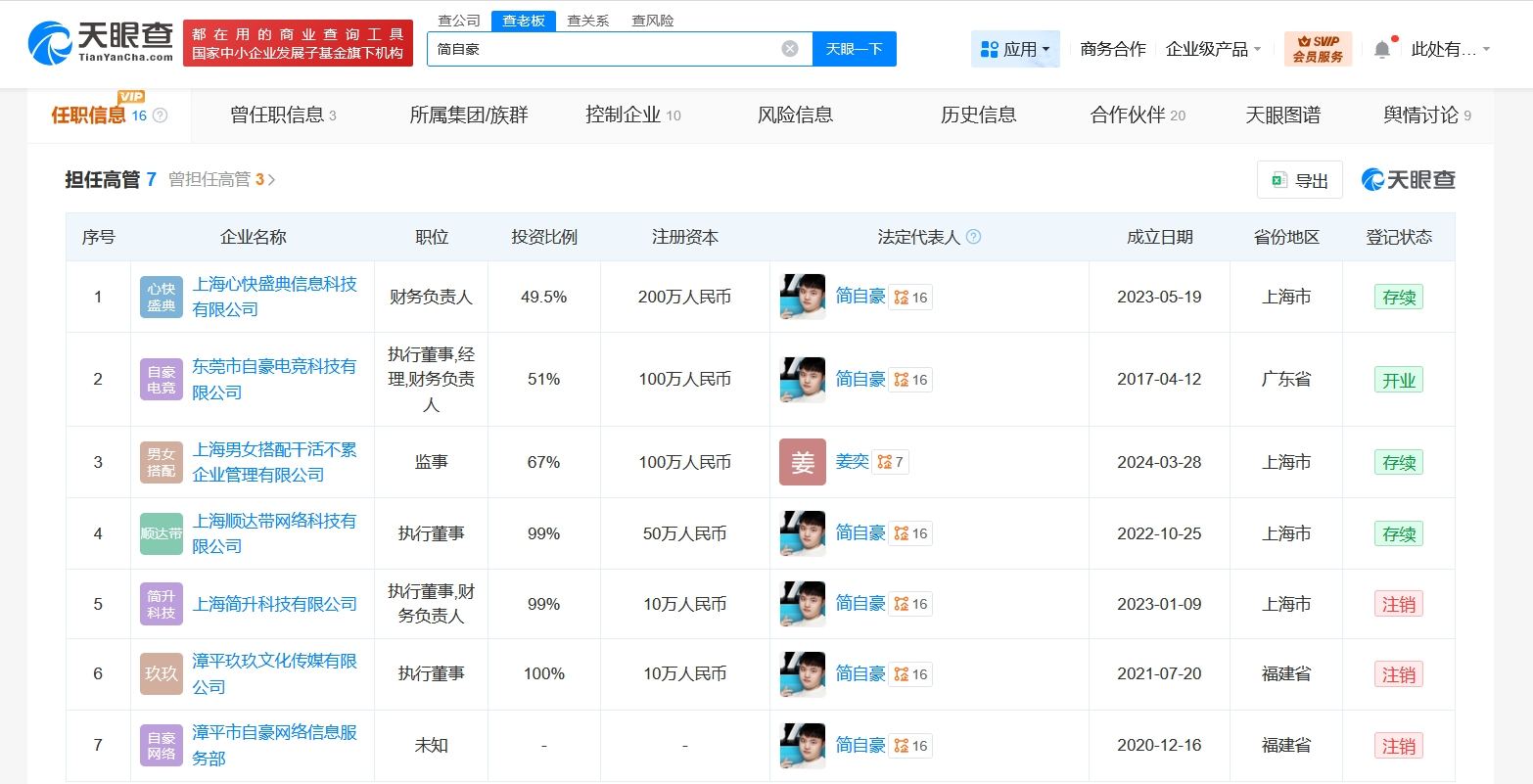 天眼查App显示,简自豪名下关联16家企业,其中4家为存续或开业状态,包括上海心快盛典信息科技有限公司、东莞市自豪电竞科技有限公司、上海男女搭配干活不累企业管理有限公司、上海顺达带网络科技有限公司,简自豪在上述公司中担任执行董事、经理、财务负责人等职务,并持有多家公司股份。