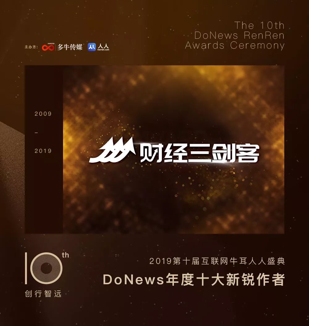2019第十届互联网牛耳人人盛典在北京M空间落幕,财经三剑客被授予“DoNews年度十大新锐作者”。