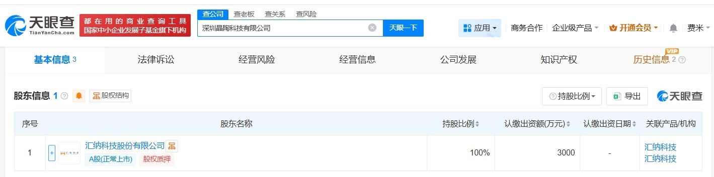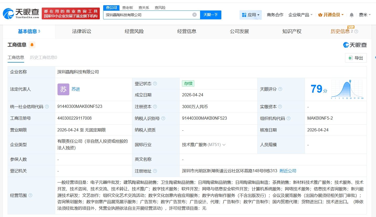 天眼查App显示,4月24日,深圳晶陶科技有限公司成立,法定代表人为苏进,注册资本3000万人民币,经营范围包括电子元器件批发、建筑陶瓷制品销售、卫生陶瓷制品销售、日用陶瓷制品销售等,由汇纳科技(300609)全资持股。