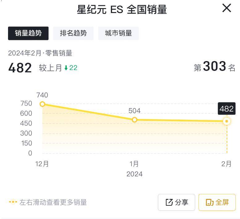 2024年2月份,星纪元ES的单月零售销量,再度下滑了。行业综合销量数据显示,2024年2月份,星纪元ES的单月零售销量为482台。