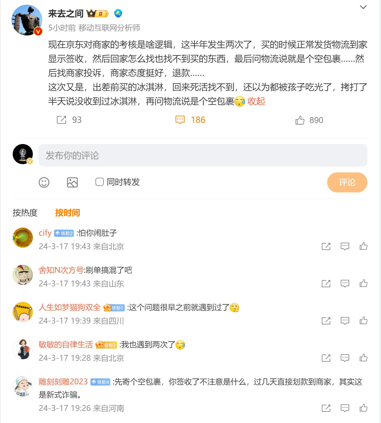 前不久微博的CEO王高飞还表示,京东对商家的考核是啥逻辑?半年发生两次了,买到的时候正常发货,物流到家显示签收,回家怎么也找不到买到的东西。最后物流显示是个空包裹。