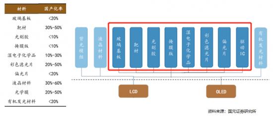 LCD和OLED共同需要的显示材料主要有玻璃基板、驱动IC、偏光片、光刻胶、彩色滤光片等8种。