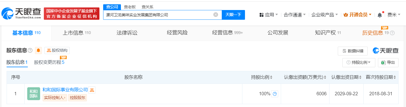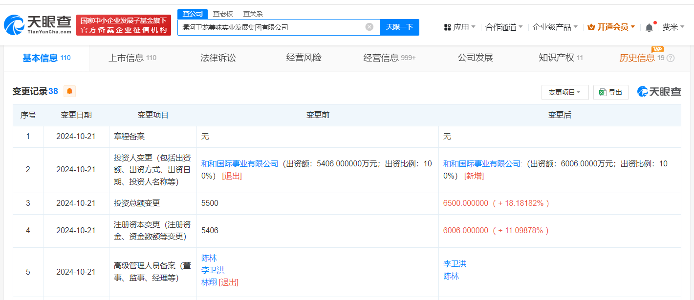 漯河卫龙美味实业发展集团有限公司成立于2018年8月,法定代表人为陈林,经营范围含食品销售、食品进出口、货物进出口、技术进出口、进出口代理、食品添加剂销售等,由和和国际事业有限公司全资持股。