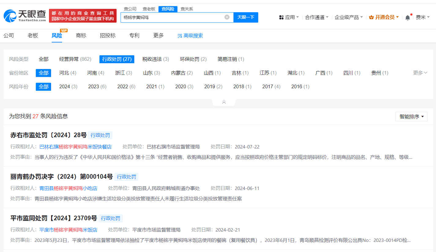 天眼风险信息显示,曾有多家杨铭宇黄焖鸡米饭店被罚,包括平度市杨铭宇黄焖鸡米饭店、韩城市杨铭宇黄焖鸡米饭店等。