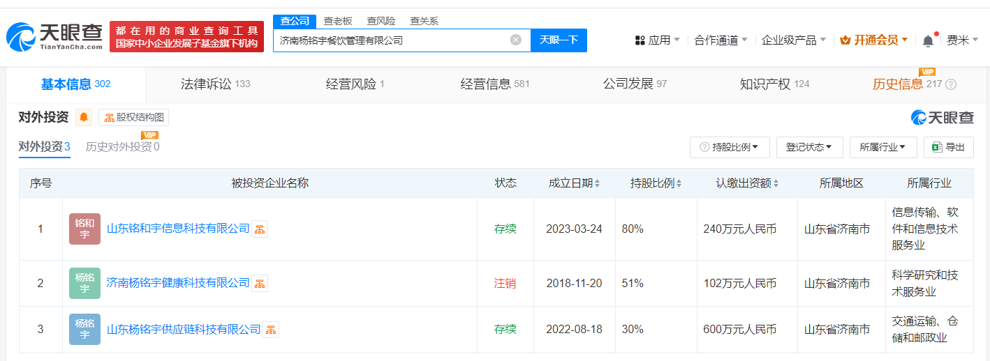 天眼查App显示,济南杨铭宇餐饮管理有限公司成立于2011年12月,法定代表人为杨晓路,注册资本1000万人民币,经营范围含餐饮服务、食品销售、第二类增值电信业务等,由杨晓路全资持股。对外投资信息显示,该公司对外投资3家公司,其中2家处于存续状态,分别是山东铭和宇信息科技有限公司、山东杨铭宇供应链科技有限公司。