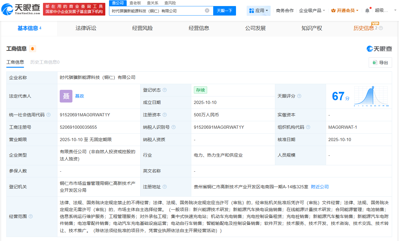 天眼查App显示,近日,时代骐骥新能源科技(铜仁)有限公司成立,法定代表人为聂政,注册资本500万人民币,经营范围包括新兴能源技术研发、新能源汽车换电设施销售、电动汽车充电基础设施运营等。
