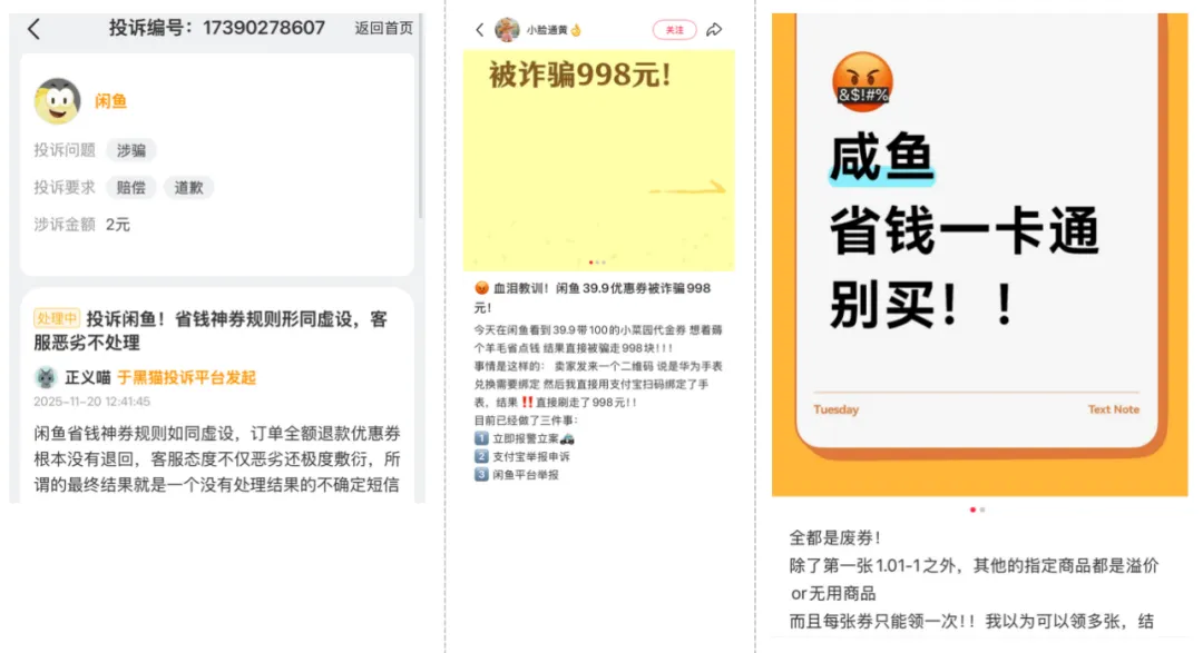 用户反映,恶意不发货、不退款、货不对版、虚假宣传、诱导线下交易,甚至闲鱼小法庭也成了投诉的原因。目前,仅黑猫投诉平台一处,闲鱼已累计被投诉超 26 万次,解决不到 1.2 万次,投诉处理率仅为 4.5%。