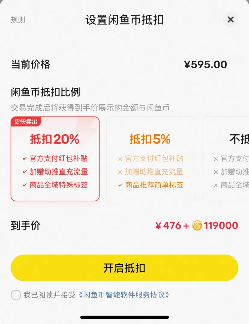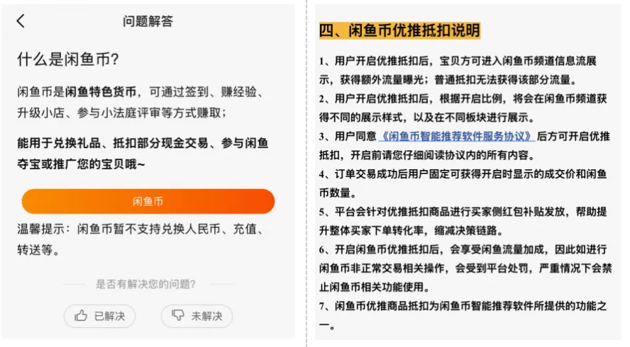 今年 4 月,闲鱼将原有的“闲鱼币普通抵扣”升级为“闲鱼币优推抵扣”。此前的普通抵扣,其核心玩法与其他购物平台的类似的积分优惠策略无异,闲鱼允许买家通过使用闲鱼币抵扣一部分商品费用。