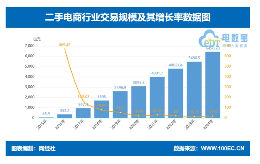 根据艾媒咨询数据显示,2024 年国内二手电商交易规模达 6144.9 亿元,同比增长 12.0%。而据“电数宝”电商大数据库显示,2024 年二手电商交易规模达 6450.2 亿元,同比增长 17.56%。