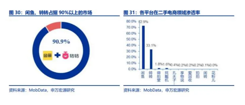 申万宏源指出,闲鱼与转转合计占据了 90% 以上的市场。其中,闲鱼的渗透率达 72.9%,远高于转转的 33.1%。