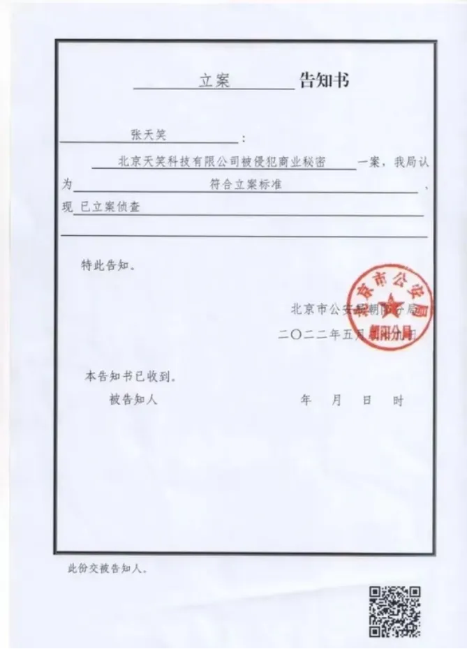 据北京天笑2024年8月于官微“查悦社保”发布的文章,2022年,北京天笑在案发后向北京市公安朝阳分局报案,当年5月,警方予以刑事立案,案件名称为“北京天笑科技有限公司被侵犯商业秘密案”;