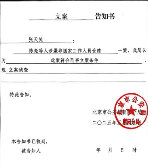 2025年12月3日,北京天笑再度于官微“查悦社保”发文,并列出案件名称为《陈亮等人涉嫌非国家工作人员受贿案立案》的立案告知书,立案时间为2025年5月。据上述文章,该刑事案件涉及天笑前高管陈某、潘某、王某某三人;