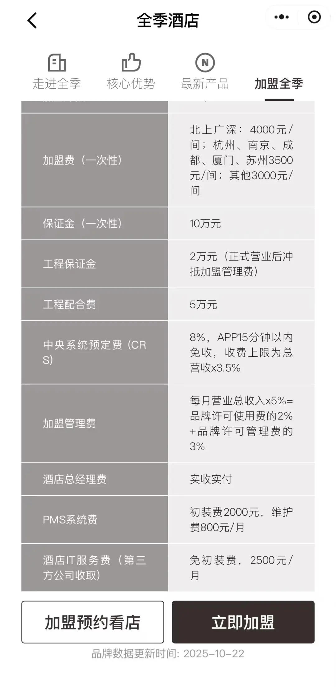 《财中社》梳理2020年招股书数据发现,华住集团通常向加盟商收取首次特许经营费,例如加盟全季酒店的标准是加盟费为2800元/间(不少于80间客房),一次性加盟费不低于18万元,并且后续加盟管理费为每月总营收5%(品牌使用费2%+品牌支持费3%),还向加盟商收取使用中央预订系统的预订费(一般为房价的 8%,上限相当于酒店总收入的 3.5%)及对在加盟酒店加入华住会的客户收取会员注册费(一般介于每位会员15元至135元,视会员等级而定)。