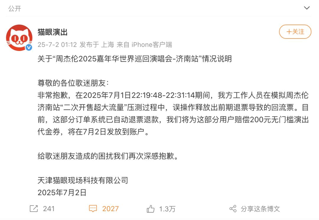 7月2日凌晨,猫眼发布公告就此事致歉。公告称,在7月1日22:19:48-22:31:14期间,已方工作人员在模拟周杰伦济南站“二次开售超大流量”压测过程中,误操作释放出前期退票导致的回流票。目前,这部分订单系统已自动退票退款,猫眼将为这部分用户赔偿200元无门槛演出代金券,将在7月2日发放到账户。“给歌迷朋友造成的困扰我们再次深感抱歉。”