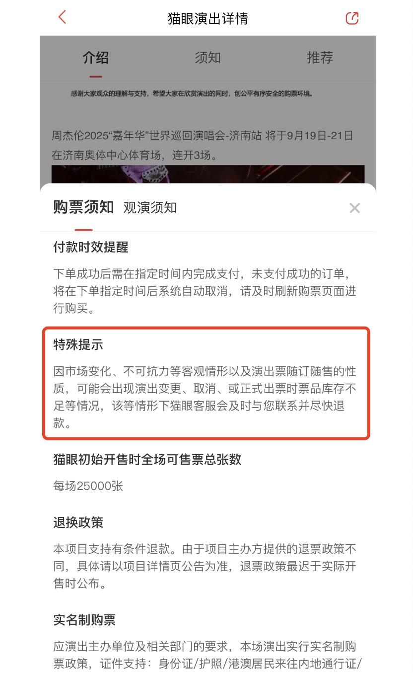 周杰伦济南演唱会猫眼售票页面的购票须知