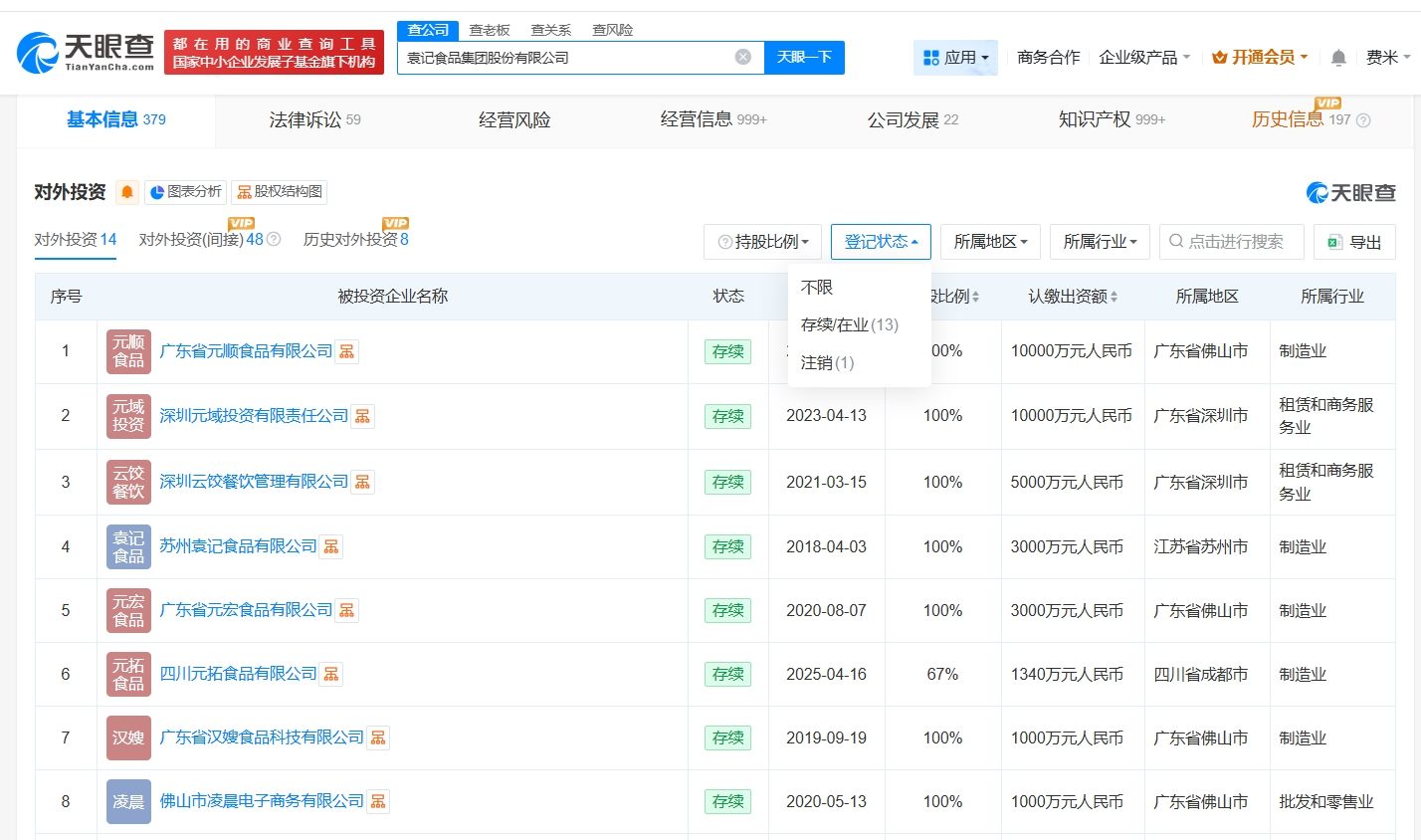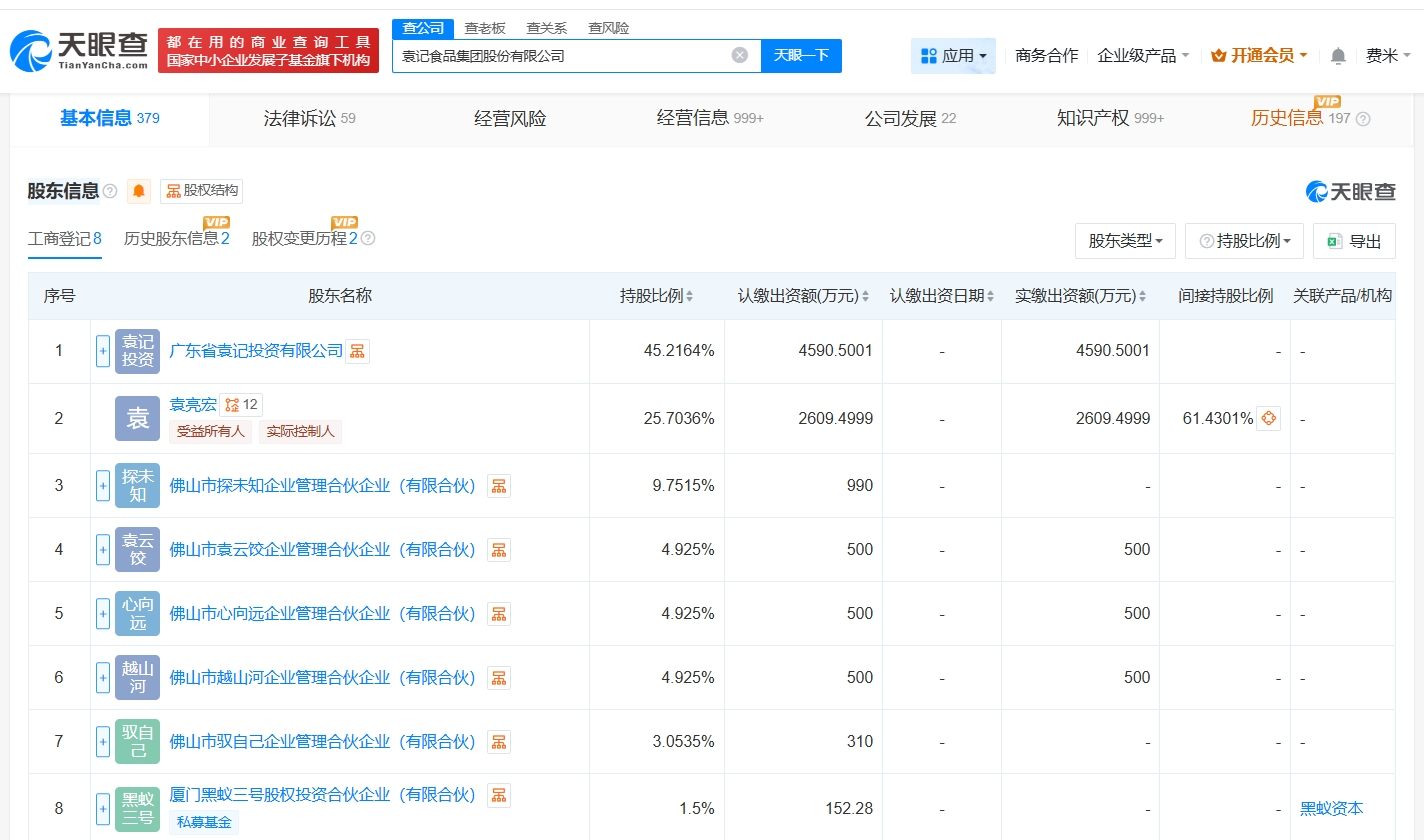 天眼查工商信息显示,袁记食品集团股份有限公司成立于2017年4月,法定代表人为创始人袁亮宏,注册资本约1.2亿人民币,经营范围包括食品销售、食品生产、互联网直播技术服务等。股东信息显示,该公司由广东省袁记投资有限公司、袁亮宏、佛山市探未知企业管理合伙企业(有限合伙)等共同持股。对外投资信息显示,该公司对外投资14家企业,其中13家处于存续状态,包括广东省元顺食品有限公司、深圳元域投资有限责任公司等。