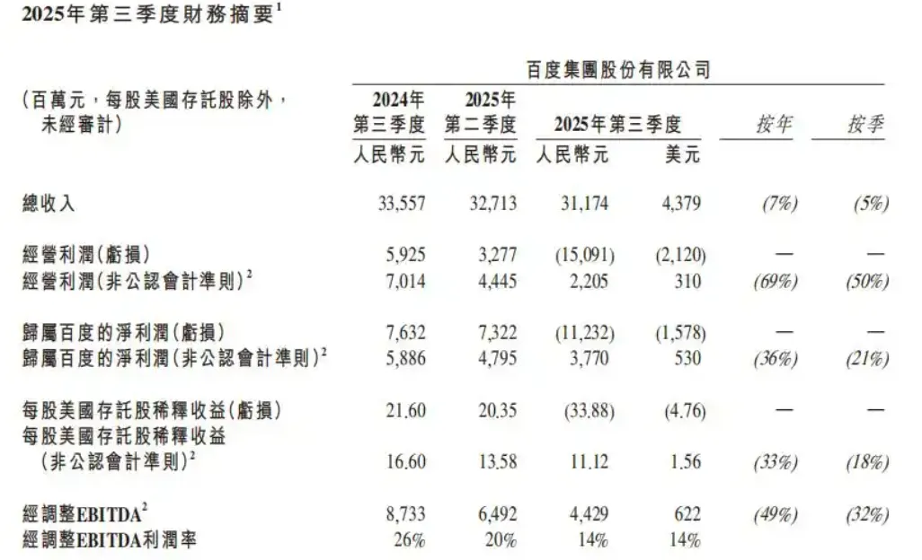 Q3财报数据显示,百度公司当季总收入312亿元,同比下降7%;季度净亏损112.3亿元,与去年同期76亿元的盈利形成鲜明反差,而曾作为“现金牛”的在线营销收入更是降至153亿元,同比下滑18%,核心搜索广告收入跌幅更是扩大至19%。