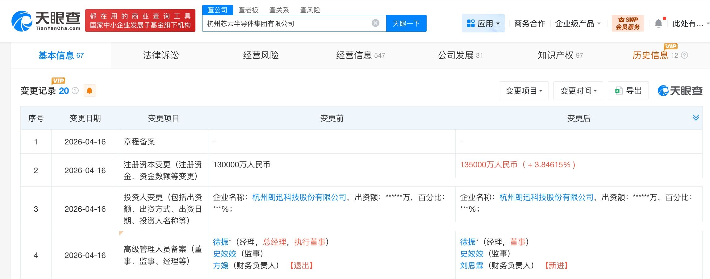 天眼查App显示,近日,杭州芯云半导体集团有限公司发生工商变更,注册资本由13亿人民币增至13.5亿人民币,增幅约4%;同时,部分高管发生变更。
