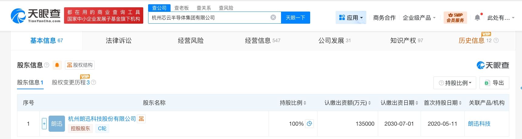 该公司成立于2020年5月,法定代表人为徐振,经营范围含集成电路芯片及产品销售、集成电路芯片设计及服务、电子元器件制造、半导体器件专用设备制造、软件开发、信息技术咨询服务等,由杭州朗迅科技股份有限公司全资持股。